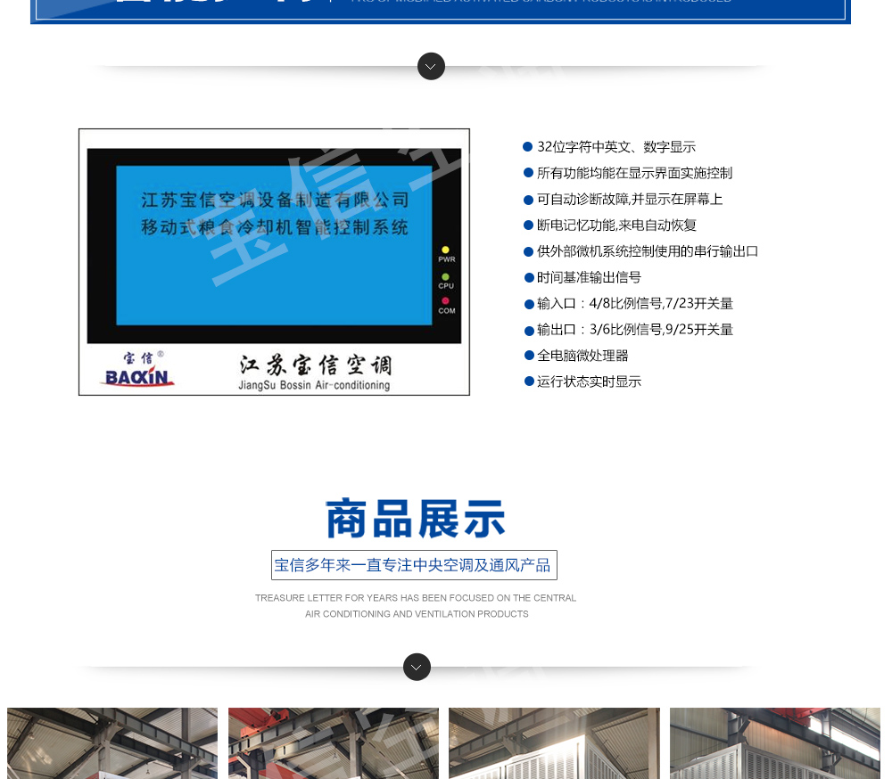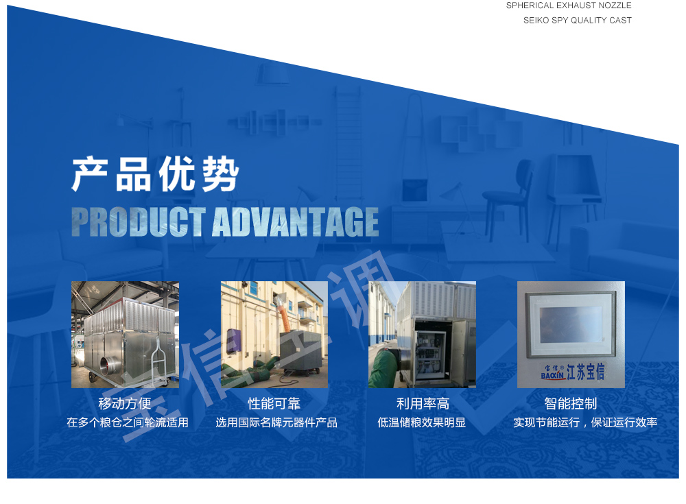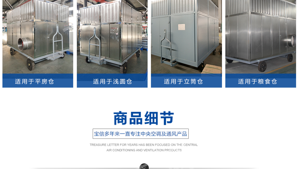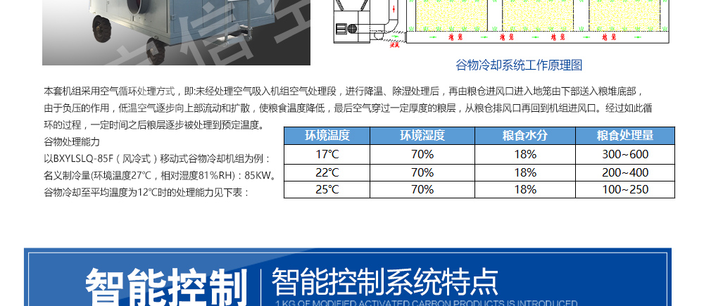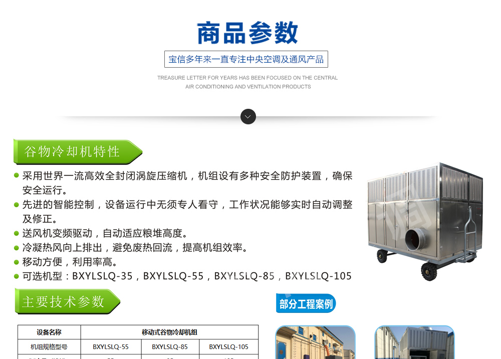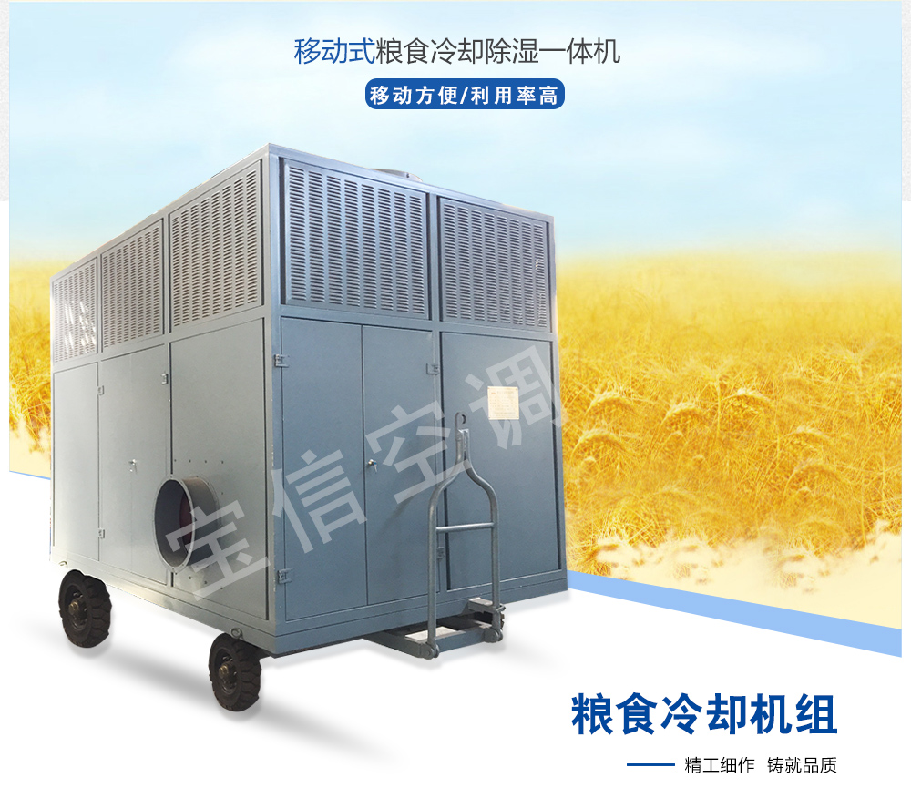 移动式粮食冷却机组主要由风(水)冷压缩机制冷除湿系统,空气循环系统,智能控制系统和移动式基座组成。该空凋设备是专门针对我国粮食仓储环境特点和气候特征综合分析而特别设计的移动设备,是各粮食储备库实现绿色储粮、科学保粮目标的重要保障手段,其性能达到国内先进水平。该产品适用于:应急处理发热粮食、安全保存高水分粮食、优质稻谷的低温储存等,可用于平房仓、浅圆仓、立筒仓的粮食冷却除湿作业。