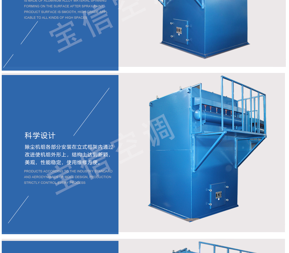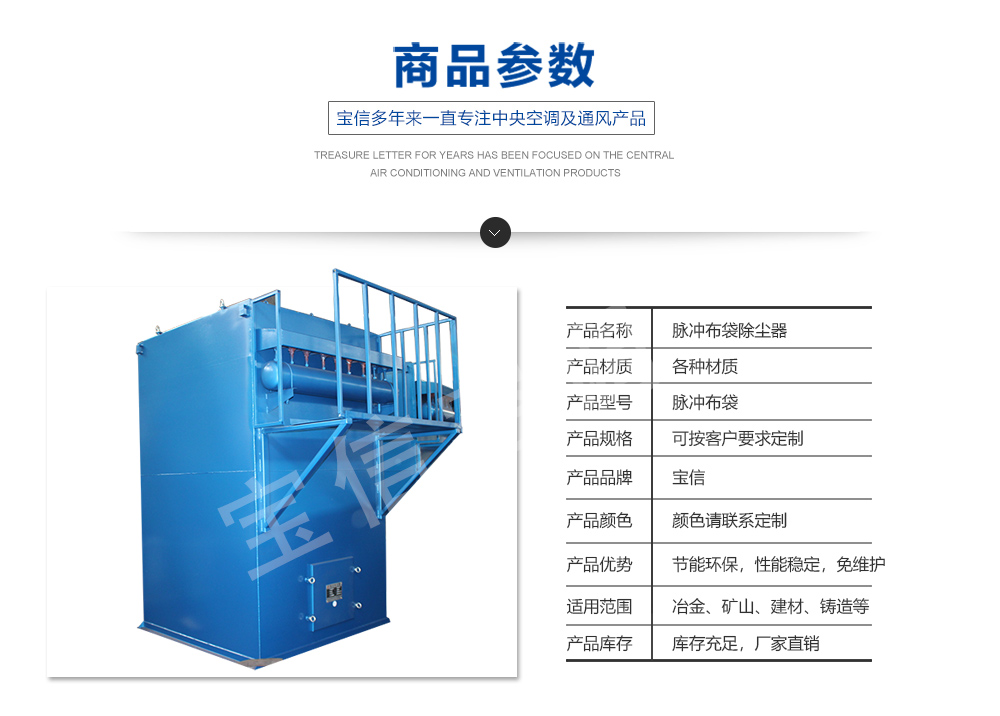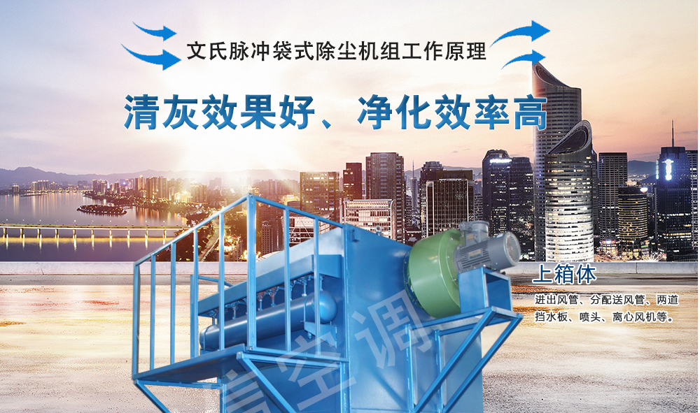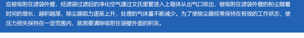 含尘空气由除尘器底下进入除尘器箱体中部,颗粒较粗的粉尘靠其自身重力向下沉降后落入灰仓,细小粉尘通过各种效应被吸附在滤袋外壁,经滤袋过滤后的净化空气通过文氏里管进入上箱体从出气口排出,被吸附在滤袋外壁的粉尘随着时间的增长,越积越厚,除尘器阻力逐渐上升,处理的气体量不断减少。为了使除尘器经常保持在有效的工作状态,使压力损失保持在一定范围内,就需要清除吸附在袋壁外面的积灰。