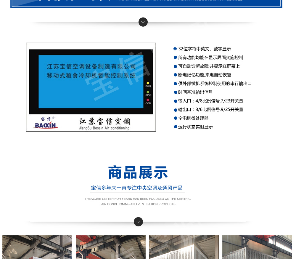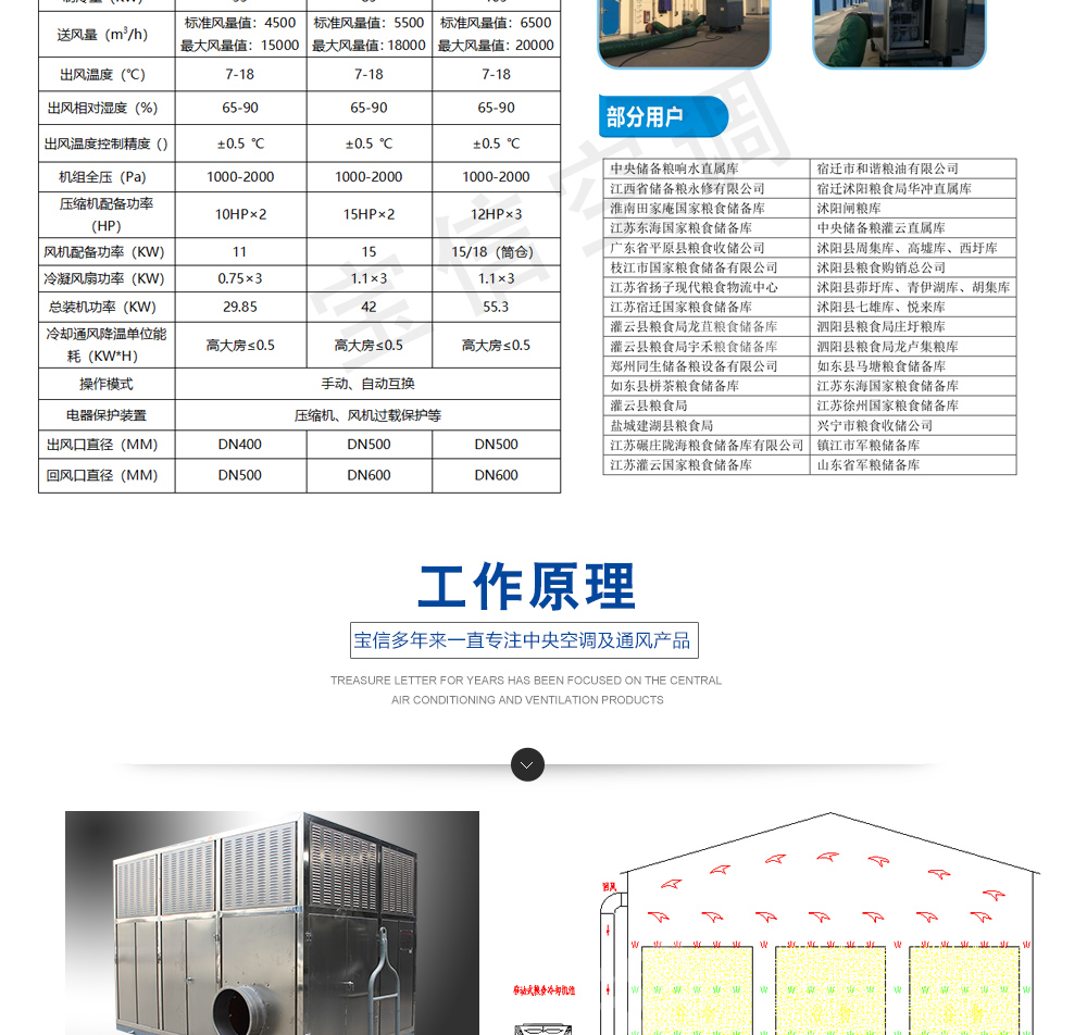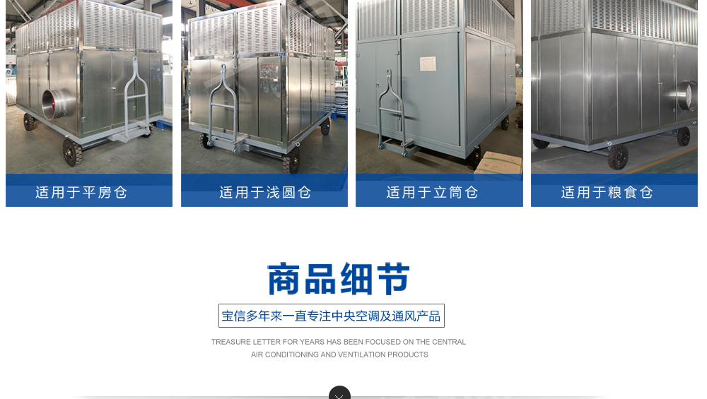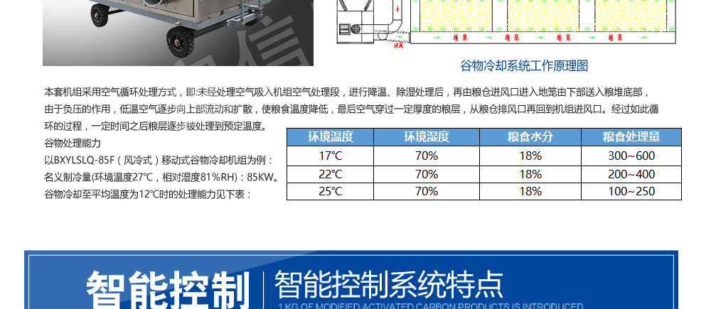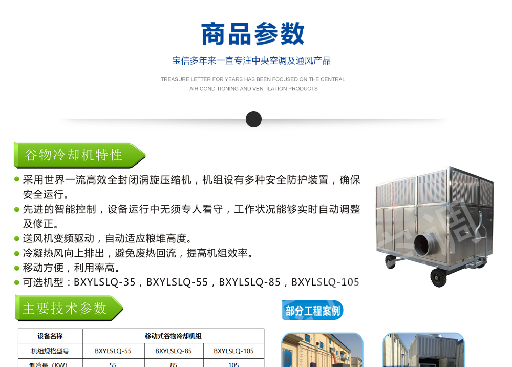 移动式粮食冷却机组主要由风(水)冷压缩机制冷除湿系统,空气循环系统,智能控制系统和移动式基座组成。该空凋设备是专门针对我国粮食仓储环境特点和气候特征综合分析而特别设计的移动设备,是各粮食储备库实现绿色储粮、科学保粮目标的重要保障手段,其性能达到国内先进水平。该产品适用于:应急处理发热粮食、安全保存高水分粮食、优质稻谷的低温储存等,可用于平房仓、浅圆仓、立筒仓的粮食冷却除湿作业。