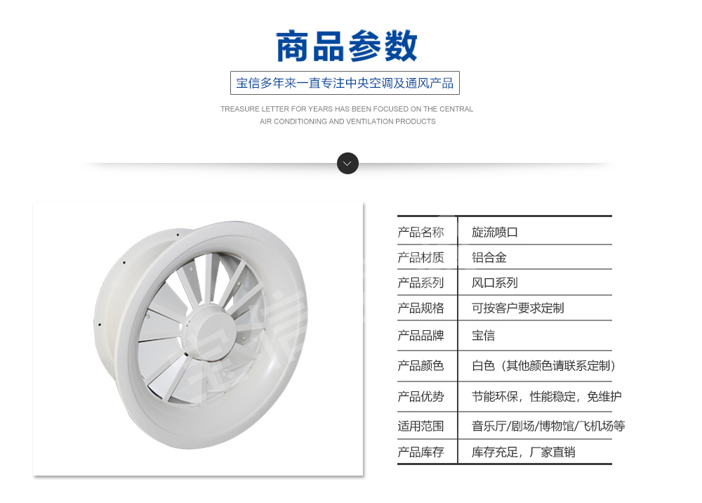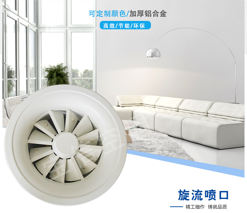 旋流风口既可安装在层高很到的公共场所(如:工业厂房、机场、剧院、银行营业厅等),也可安装在层3.8m的室内(如会议室),尤其适合于送风温差从-10K+15K范围内变化的场所。