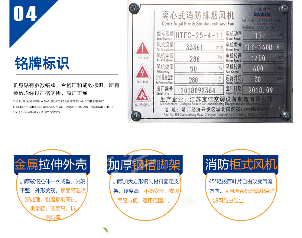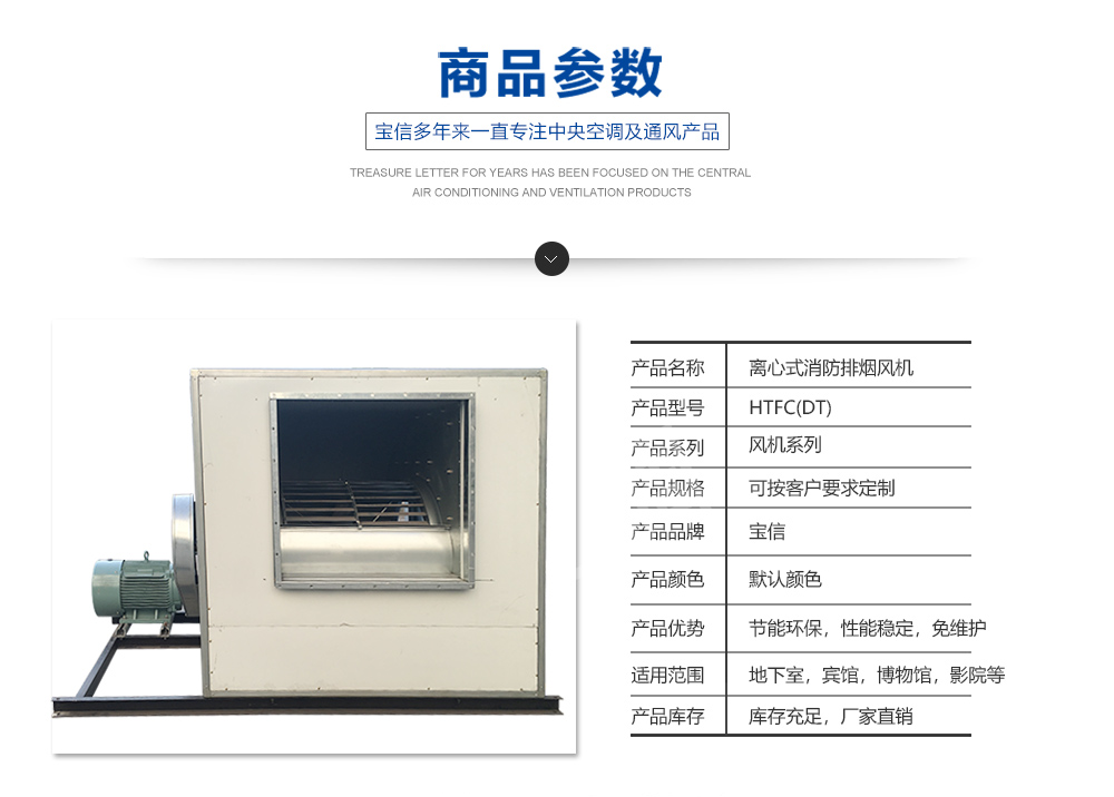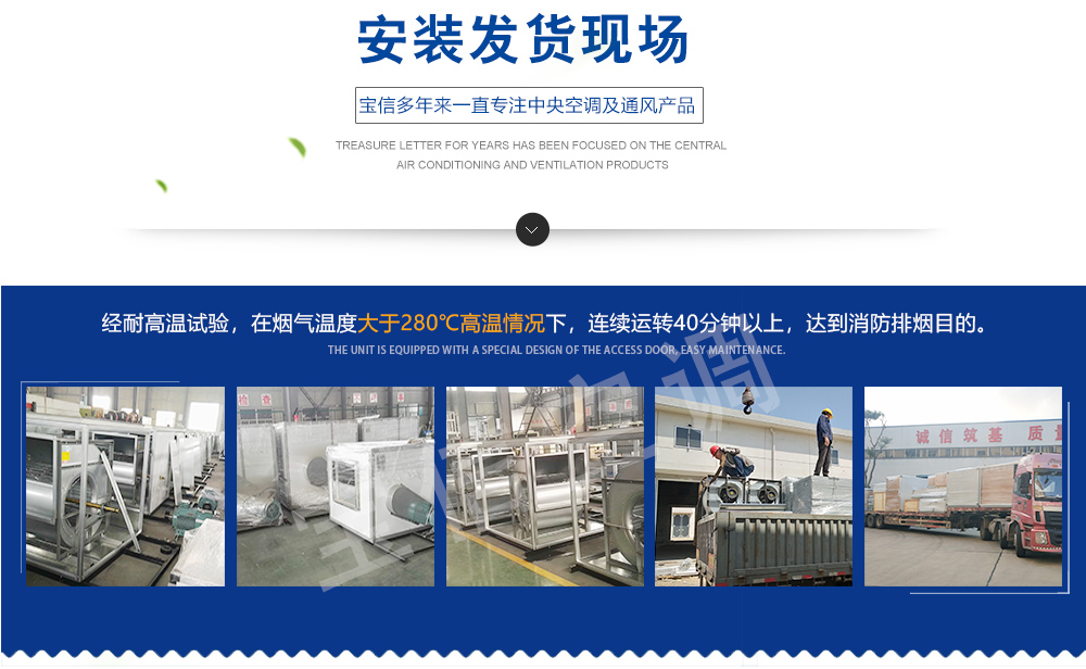 3、 输送气体的温度:经耐高温试验,在烟气温度大于280℃高温情况下,连续运转40分钟以上,达到消防排烟目的。