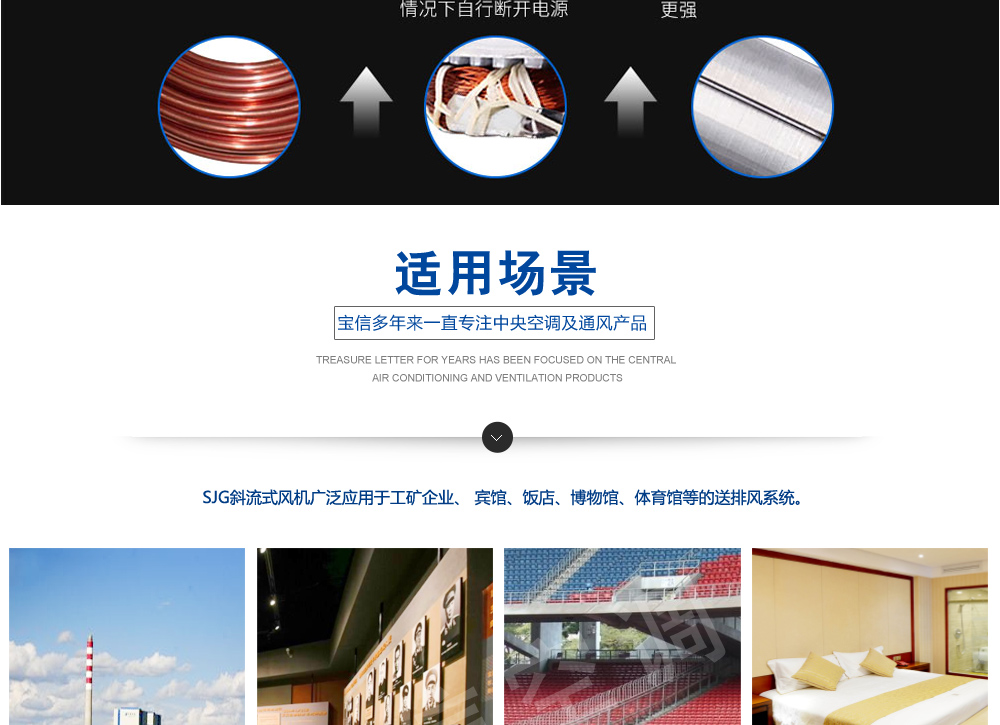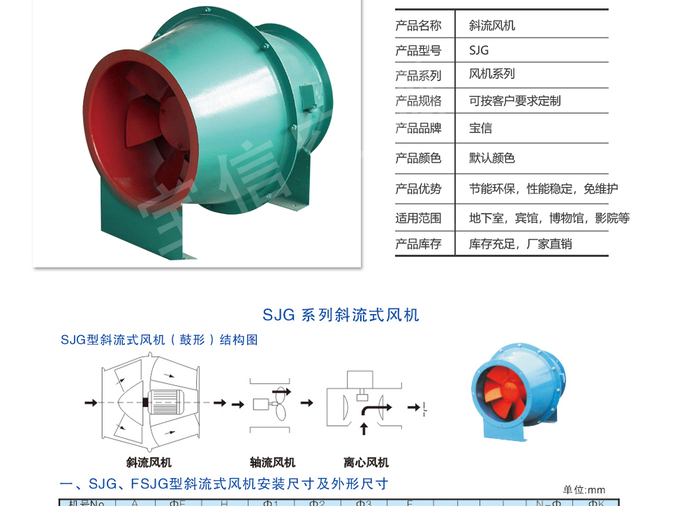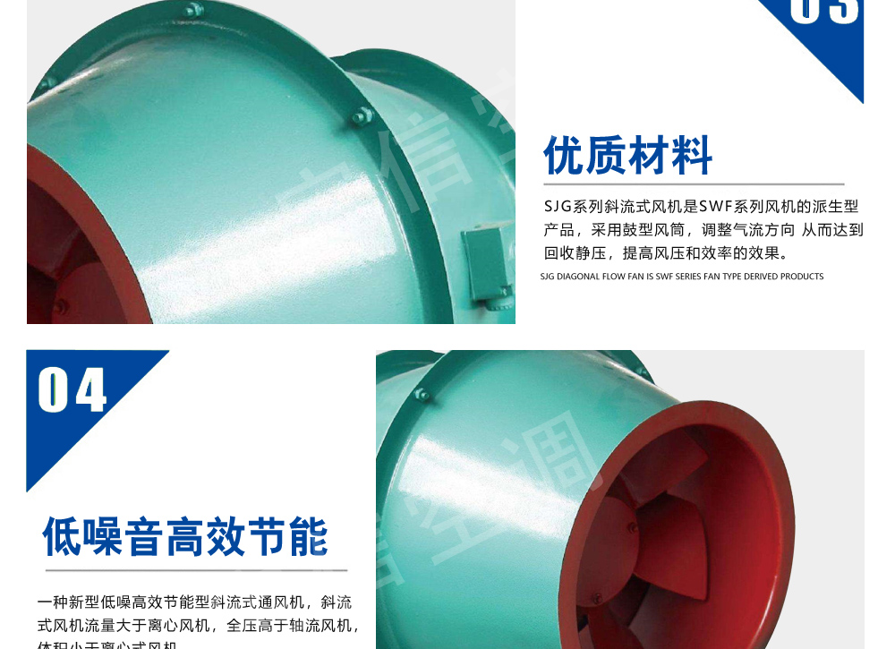 SJG斜流式风机是一种新型低噪高效节能型斜流式通风机,斜流式风机流量大于离心风机,全压高于轴流风机,体积小于离心式风机。SJG系列斜流式风机是SWF系列风机的派生型产品,采用鼓型风筒,调整气流方向 从而达到回收静压,提高风压和效率的效果。