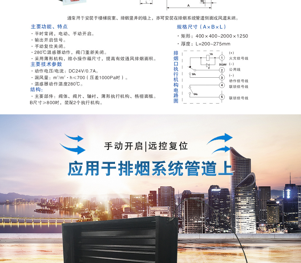 自动复位防烟防火调节阀通常安装在既需防火又需排烟场所的通风管道上,也可用于气体灭火系统的风管上或吊装在高处顶棚内的通风空调管道上。