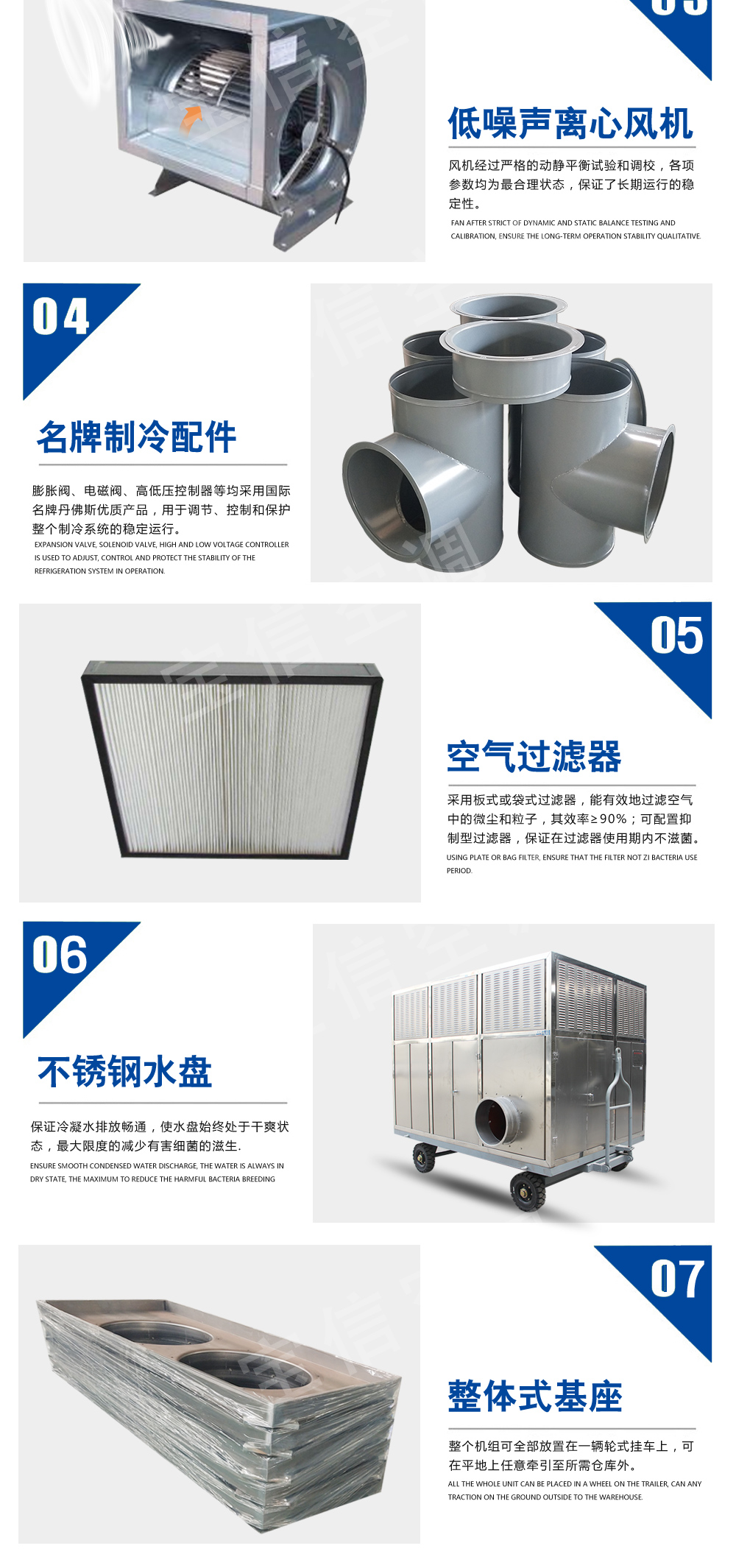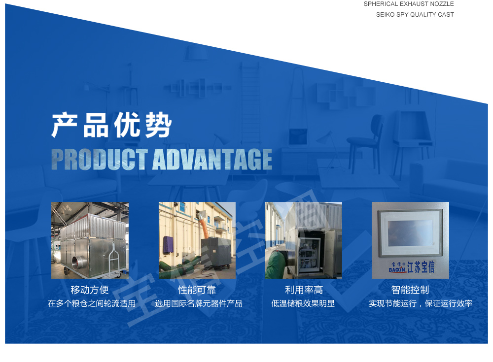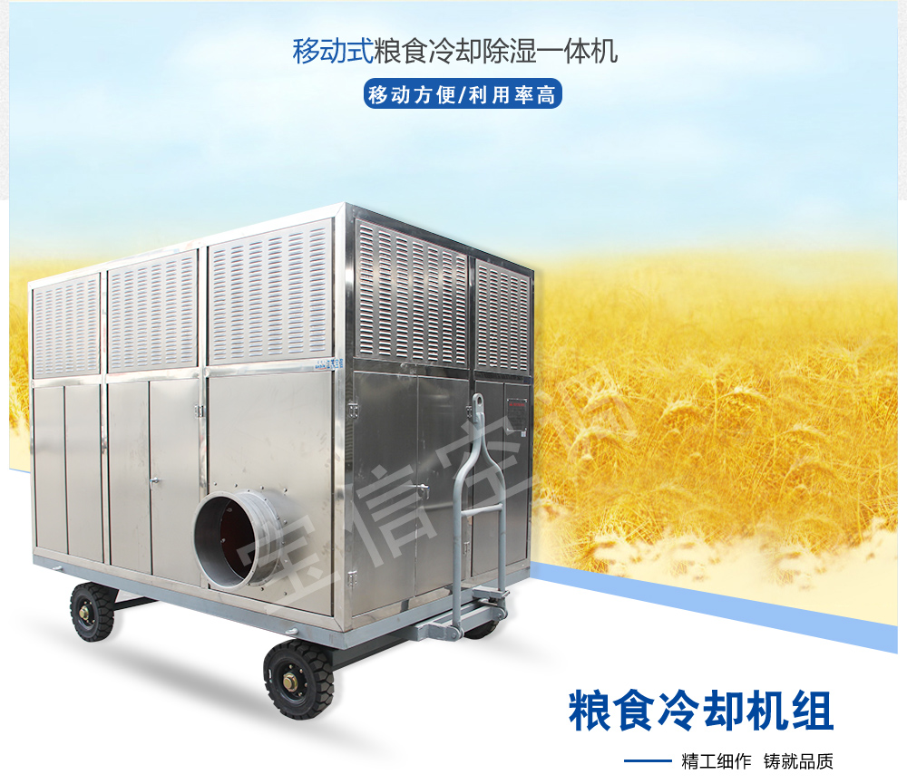 移动式粮食冷却机组主要由风(水)冷压缩机制冷除湿系统,空气循环系统,智能控制系统和移动式基座组成。该空凋设备是专门针对我国粮食仓储环境特点和气候特征综合分析而特别设计的移动设备,是各粮食储备库实现绿色储粮、科学保粮目标的重要保障手段,其性能达到国内先进水平。该产品适用于:应急处理发热粮食、安全保存高水分粮食、优质稻谷的低温储存等,可用于平房仓、浅圆仓、立筒仓的粮食冷却除湿作业。