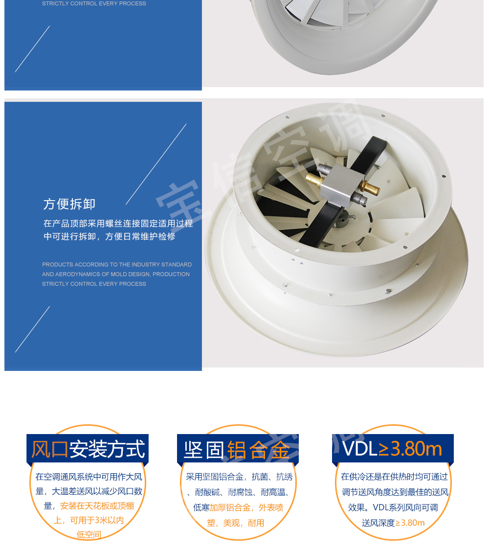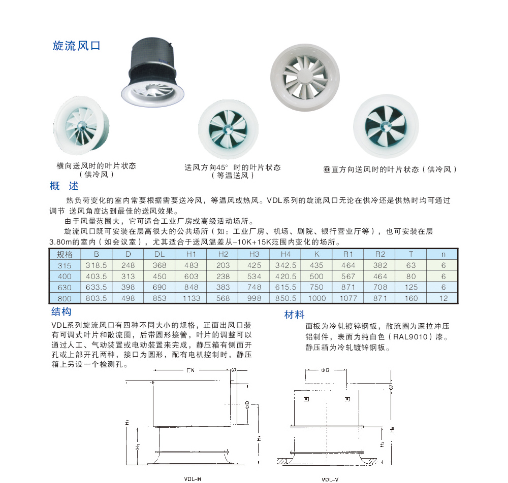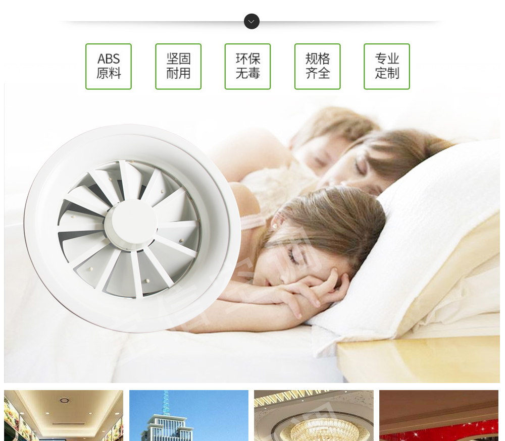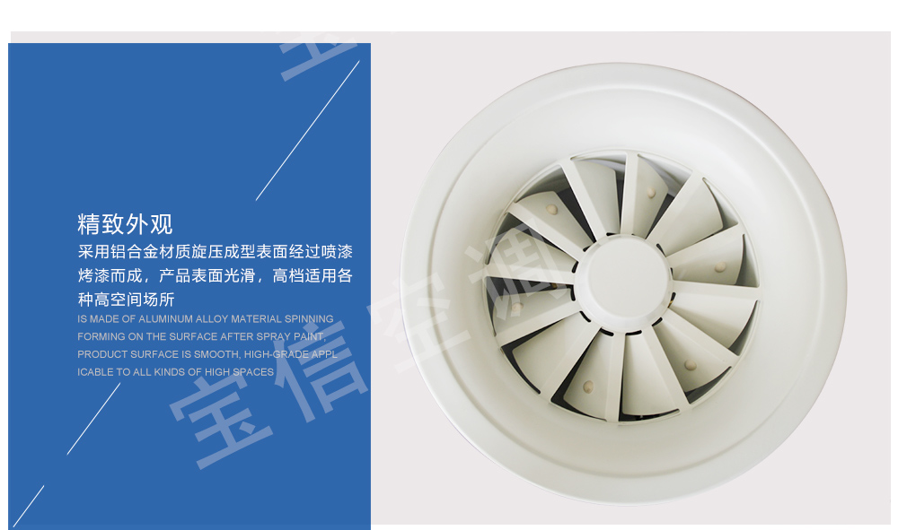 旋流风口既可安装在层高很到的公共场所(如:工业厂房、机场、剧院、银行营业厅等),也可安装在层3.8m的室内(如会议室),尤其适合于送风温差从-10K+15K范围内变化的场所。