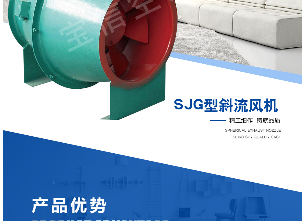 SJG斜流式风机是一种新型低噪高效节能型斜流式通风机,斜流式风机流量大于离心风机,全压高于轴流风机,体积小于离心式风机。SJG系列斜流式风机是SWF系列风机的派生型产品,采用鼓型风筒,调整气流方向 从而达到回收静压,提高风压和效率的效果。